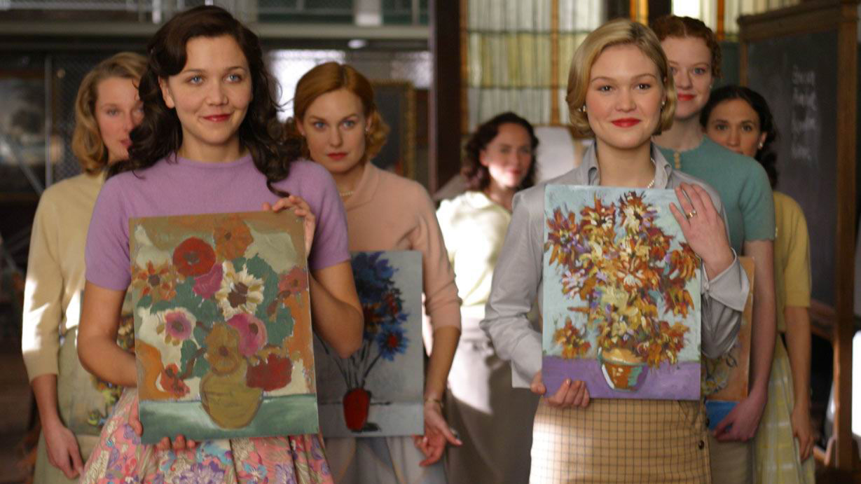 Режиссера фильма Майка Ньюэлла («Донни Браско», «Четыре свадьбы и одни похороны») часто обвиняют в том, что он снял женскую версию «Общества мертвых поэтов». Сходство действительно есть: главная героиня, преподавательница Кэтрин Энн Уотсон, приезжает в частный женский колледж, чтобы через разговоры об искусстве заставить девушек пересмотреть взгляды на свое место в мире. Но если в «Обществе» юноши стараются найти призвание среди множества доступных им профессий, в «Улыбке» девушки осознают, что могут добиться большего, чем просто удачно выйти замуж.
